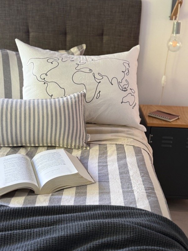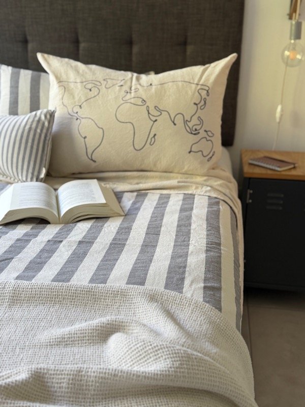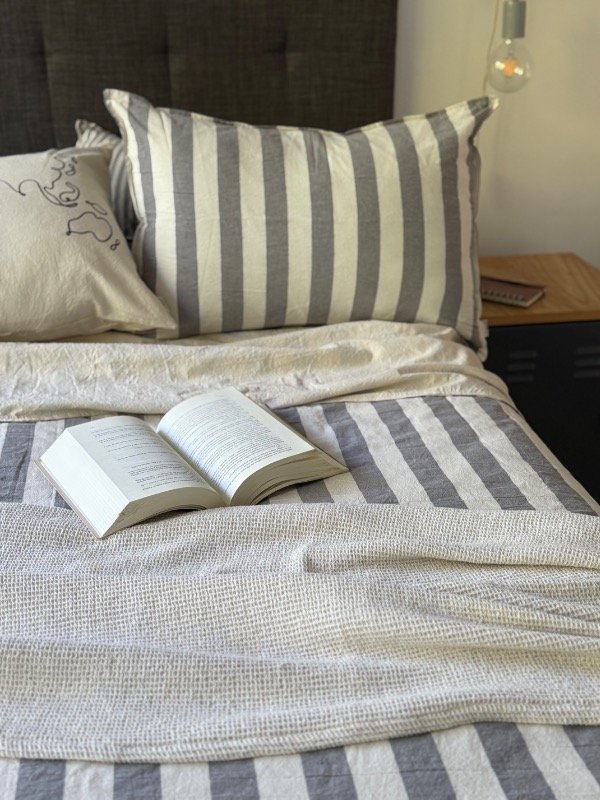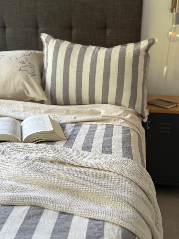 Cubre edredón confeccionado un lado en Tusor Rayado (fajas de 4cm) y del otro Tusor liso 100% algodón, reversible y con cierre oculto en un lateral.